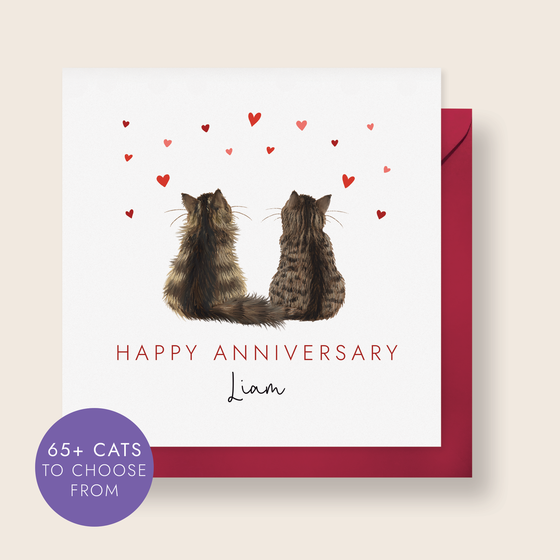 This sweet two cats anniversary card makes a special message for your other half - perfect for girlfriend, boyfriend, fiancé, fiancée, husband, wife and partner. You can choose from a wide range of designs for both cats on the card - options include ragdoll, bengal, black, ginger, tabby, calico and more! Add a name to your card for a special personalised message for any anniversary, from 1st to 10th.