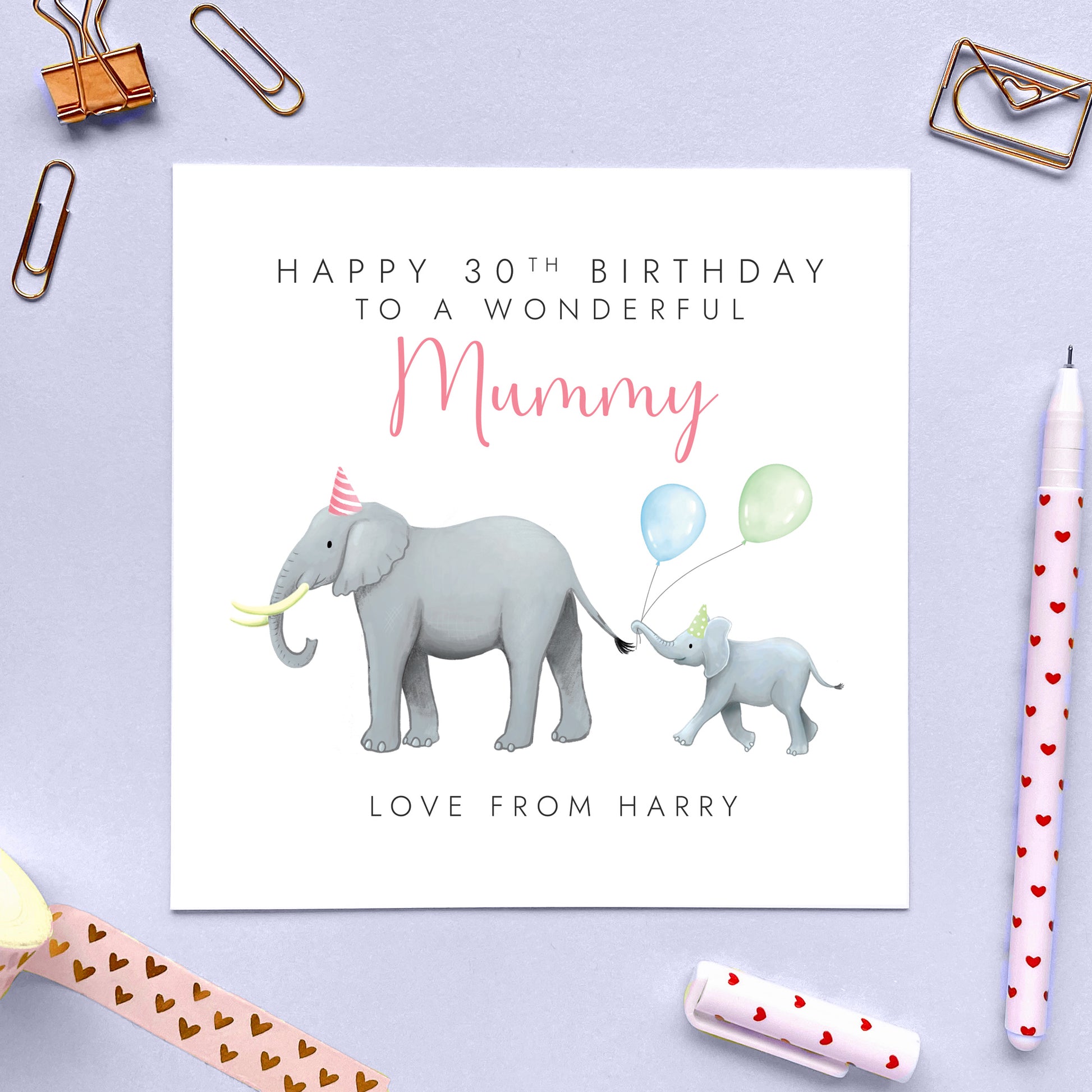 Celebrate her special day with a cute personalised elephants birthday card for Mum. Featuring an elephant with her baby, it makes a sweet message for any Mother including Mummy, Mommy, Mum, Mom or Mama. Ideal for any age including 30th, 40th, 50th and 60th.