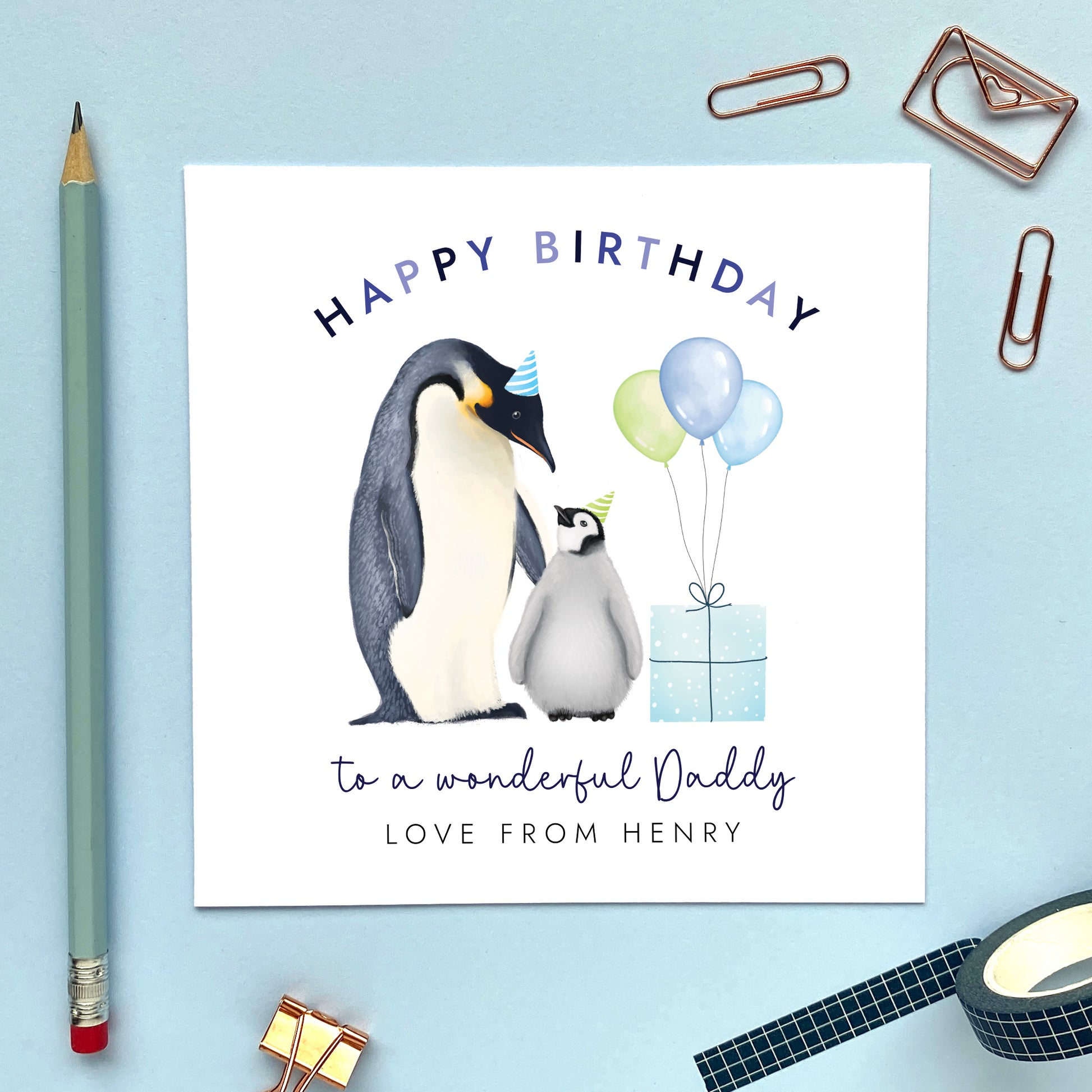 Celebrate his special day with this unique Personalised Penguins Birthday Card for Dad! Add any name after 'Love from' and choose to add any age to make it a special birthday card for any father, Dad, Daddy or Dada.