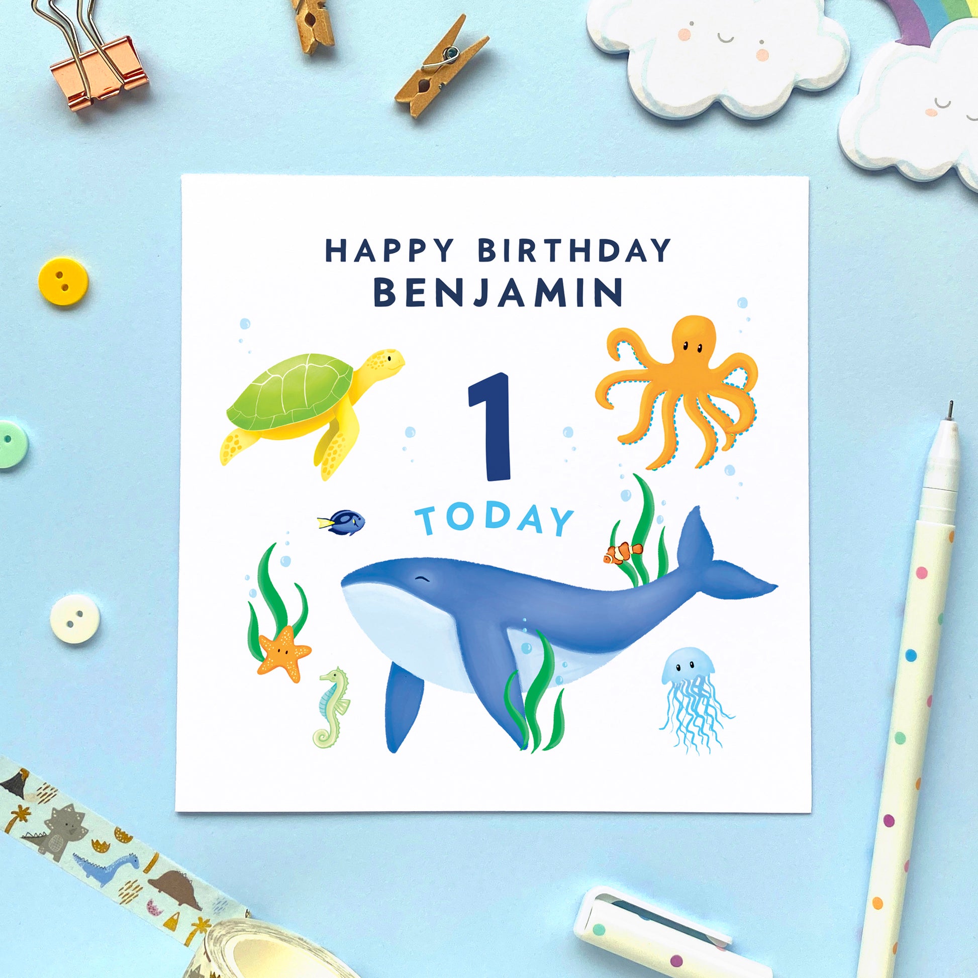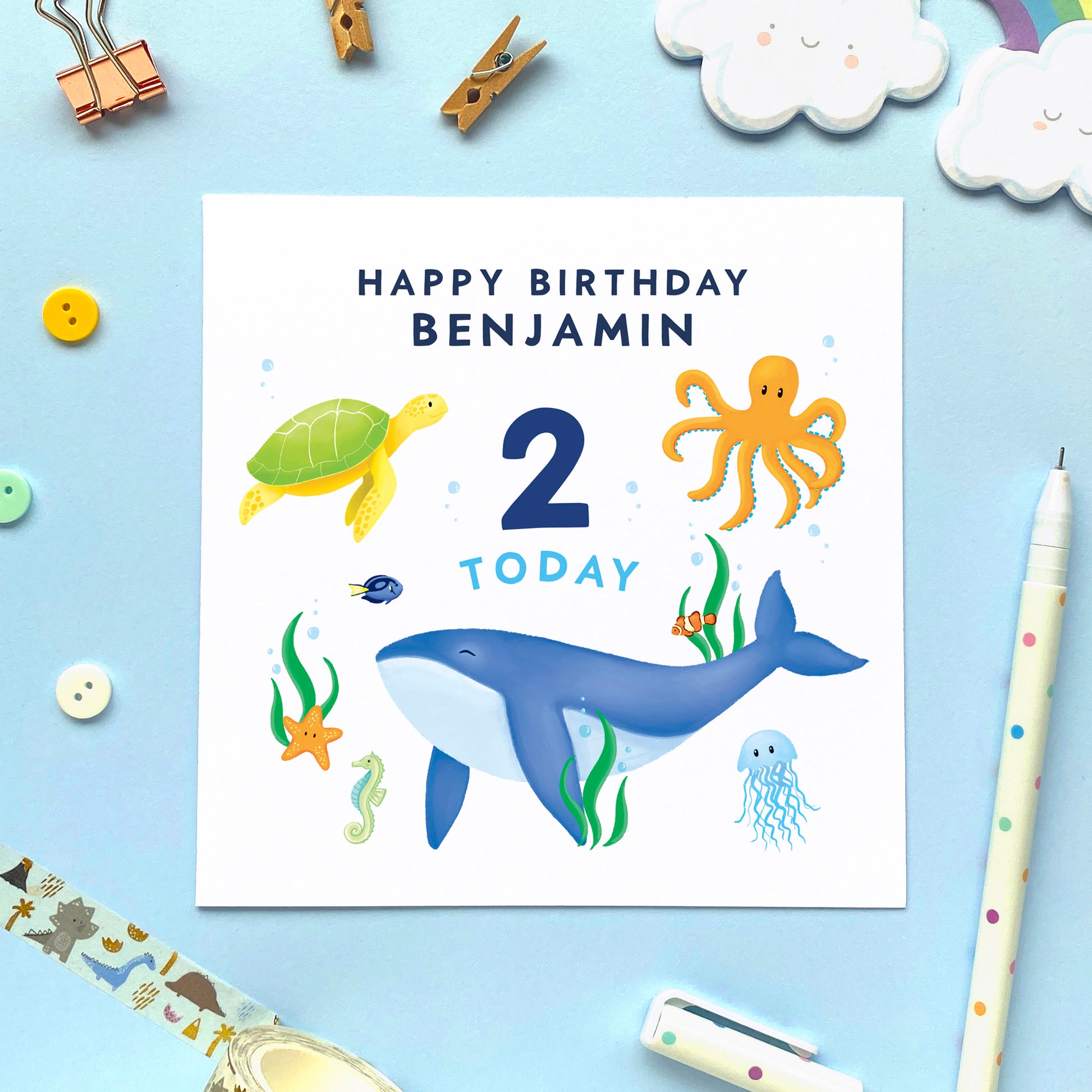 This bright and colourful ocean themed birthday card is perfect for any little boy or girl's birthday! Featuring a variety of ocean animals, it's ideal for son, grandson, daughter, granddaughter, niece, nephew, brother and sister. Select any age for the card including 1st, 2nd, 3rd, 4th and 5th.